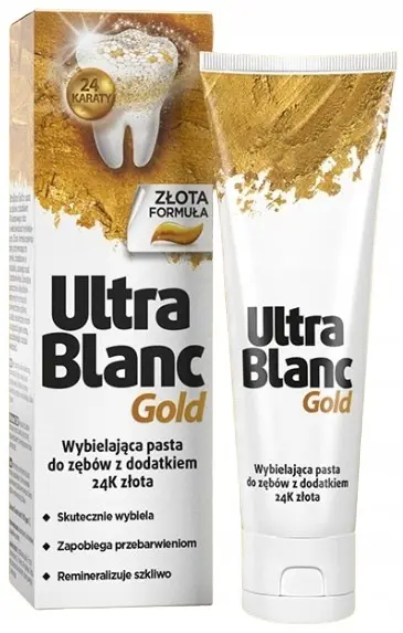 UltraBlanc Gold to pasta do zębów z dodatkiem 24-karatowego złota o właściwościach wybielających. Złota formuła poleruje zęby, przywracając im połysk, dodatkowo je rozjaśnia, usuwając osad i przebarwienia. Specjalne połączenie składników aktywnych wzmacnia powierzchnię szkliwa, a także skutecznie chroni i oczyszcza jamę ustną, pozostawiając uczucie świeżości. Witamina C (SAP) wykazuje działanie hamujące wzrost bakterii jamy ustnej odpowiedzialnych za występowanie zmian próchniczych Stosowanie Zaleca się szczotkowanie zębów 2-3 razy dziennie przez 2-3 minuty. Pasta przeznaczona jest dla dorosłych i dzieci powyżej 12. roku życia. Po szczotkowaniu należy dokładnie wypłukać jamę ustną, unikając połykania pasty. Składniki Sorbitol, Aqua, Hydrated Silica, Propylene Glycol, Perlite, Xylitol, Glycerin, Cocamidopropyl Betaine, PEG-40 Hydrogenated Castor Oil, Sodium Fluoride, Sodium Ascorbyl Phosphate, Xanthan Gum, Menthol, Acrylates/C10-30 Alkyl Acrylate Crosspolymer, Sodium Saccharin, Gold, Eucalyptus Globulus Oil, Eugenia Caryophyllus Oil, Mentha Viridis Leaf Oil, Calcium Sodium Borosilicate, Tin Oxide, Silica, Sodium Hydroxide, Sodium Chloride, o-Cymen-5-ol, Parfum, Anethole, Eugenol, Carvone, Limonene, CI 77400, CI 77891, CI 77492, CI 77491, CI 19140, CI 15985, CI 16255, CI 28440. Nie zawiera nadtlenku wodoru i nadtlenku karbamidu.