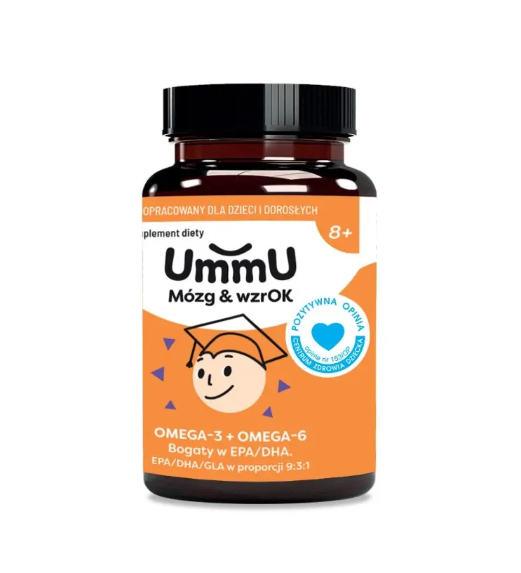 UmmU Mózg & wzrOK 8+ - suplement diety w postaci kapsułek, który zawiera kwasy EPA, DHA, GLA oraz witaminę E. Produkt przeznaczony dla dzieci powyżej 8. roku życia i dorosłych.