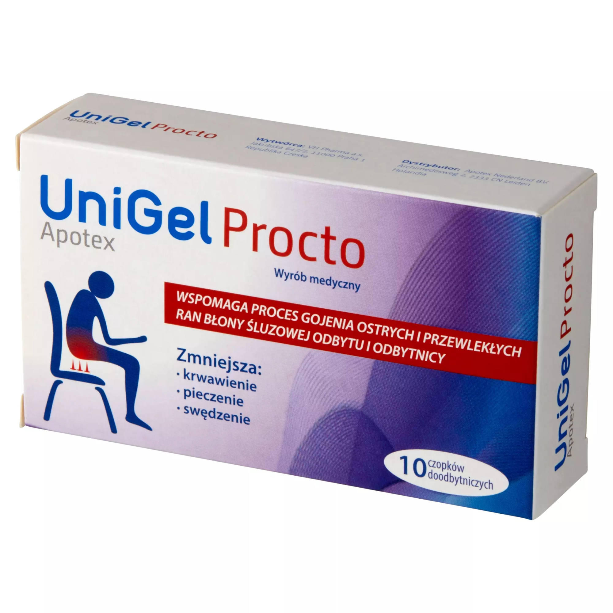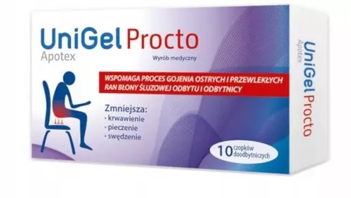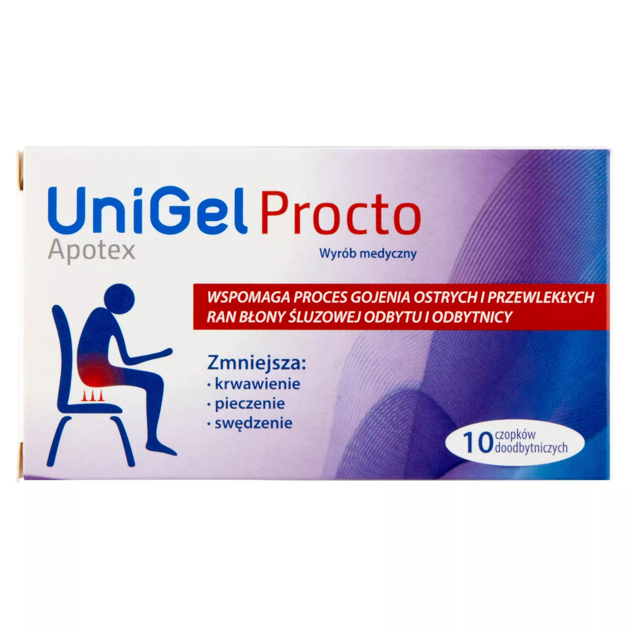 Czopki doodbytnicze Unigel Procto, przyspieszają proces gojenia zarówno ostrych jak i przewlekłych ran oraz uszkodzeń błony śluzowej odbytu i odbytnicy. Wskazane przy hemoroidach, szczelinach odbytu, uszkodzeniach okolic odbytu i odbytnicy.