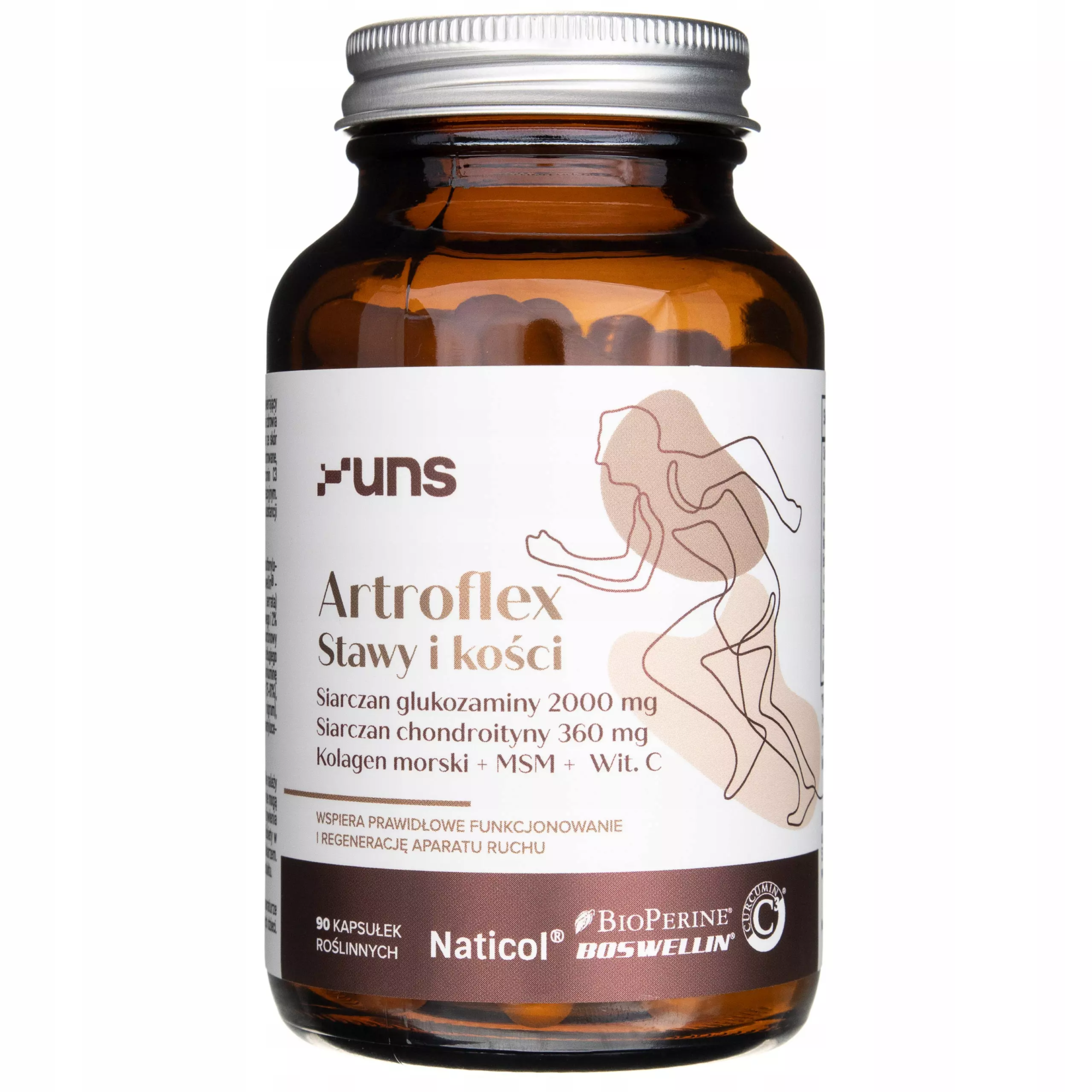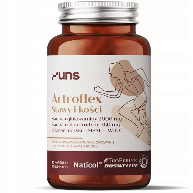 UNS Artroflex Stawy i Kości to suplement diet. Zawiera glukozaminę, chondroitynę, MSM, kolagen, witaminę C oraz standaryzowane ekstrakty Boswellin®, Curcumin C3 Reduct® i BioPerine®. Każda porcja dostarcza ponad 2900 mg substancji aktywnych, w tym kwas bosweliowy i tetrahydrokurkuminoidy, które wspierają elastyczność i regenerację chrząstki. Produkt w kapsułkach, bez sztucznych dodatków, przebadany laboratoryjnie, w hermetycznym opakowaniu dla zachowania jakości.