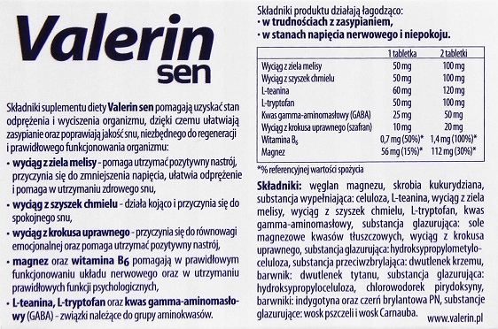 Valerin Sen jest suplementem diety w postaci 20 tabletek. Zawiera wyciągi z ziela melisy, szyszek chmielu i krokusa uprawnego, a także L-teaninę, L-tryptofan, kwas gamma-aminomasłowy, witaminę B6 oraz magnez. Preparat stosowany jest u osób, które mają problem z zasypianiem oraz żyją w stanach napięcia nerwowego i niepokoju. Produkt zmniejsza napięcie nerwowe, pomaga się odprężyć i dba o prawidłową równowagę emocjonalną. Zmniejsza czas potrzebny na zaśnięcie oraz wpływa na jakość snu, który staje się nieprzerwany i spokojny. Pomaga w ten sposób odpowiednio zregenerować się organizmowi.