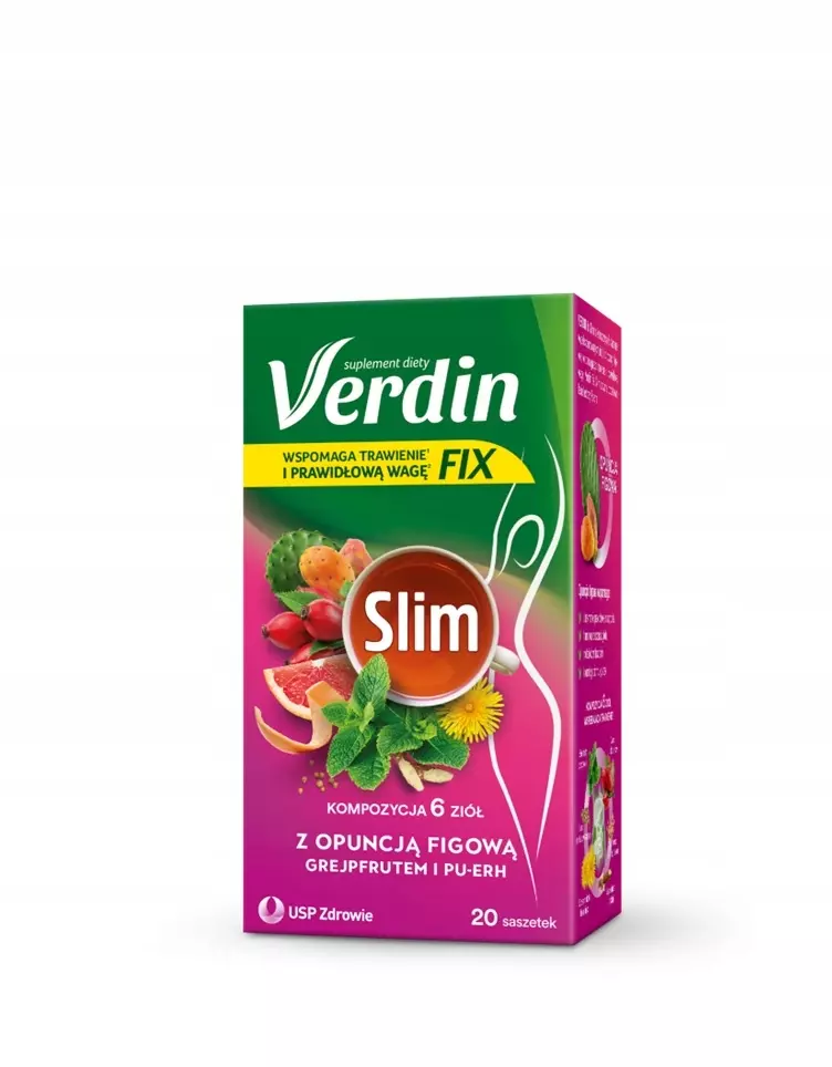 VERDIN fix Slim to kompozycja 6 starannie wyselekcjonowanych ziół, liści opuncji figowej wspomagającej trawienie i prawidłową wagę. Verdin fix Slim zawiera dodatkowo liście herbaty Pu-erh i skórkę z grejpfruta.