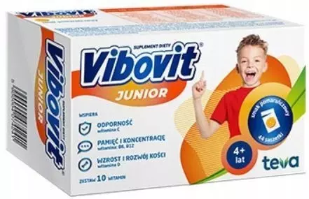 Vibovit Junior o smaku pomarańczowym to suplement diety w postaci proszku zamkniętego w saszetkach. Uzupełnia codzienną dietę dzieci w wieku 4-12 lat w zestaw 10 podstawowych witamin ważnych dla prawidłowego funkcjonowania organizmu. Jest szczególnie polecany w okresie rekonwalescencji i w okresach zwiększonego zapotrzebowania na witaminy (szczególnie w okresie jesienno-zimowym i zimowo-wiosennym).