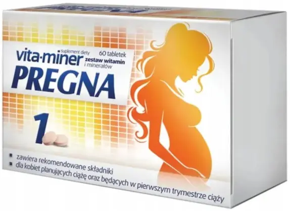 Vita-miner Pregna 1 to zestaw witamin (D, B6, B12) oraz minerałów (kwas foliowy, jod) stworzony z myślą o kobietach planujących ciążę oraz będących w pierwszym trymestrze ciąży,