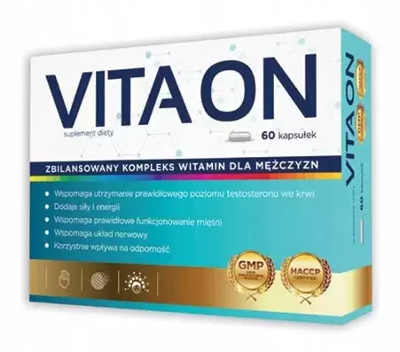 Vita ON to suplement diety polecany dla mężczyzn, który zawiera m.in. witaminę A (wspomaga metabolizm białek i hormonów, pozytywnie wpływa na wzrok i odporność organizmu), witaminę D3 (działanie antynowotworowe, niedobór prowadzi m.in. do otyłości, depresji, na rozwój chorób autoimmunologicznych), witaminę E (silny przeciwutleniacz, „witamina młodości i płodności”), witaminy z grupy B (odpowiedzialne za liczne procesy, w tym dobry nastrój czy sprawność intelektualna, synteza kwasów tłuszczowych i kontrolowanie funkcji mięśni), niacynę (bierze udział w przemianach metabolicznych kwasów tłuszczowych, węglowodanów i aminokwasów, produkcji czerwonych krwinek, obniża poziom cholesterolu, rozszerza naczynia krwionośne), oraz zestaw mikroelementów (niezbędnych do prawidłowego funkcjonowania organizmu).