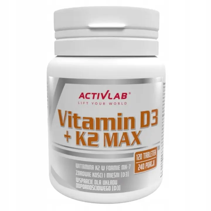 ✅Witamina D3 (8000 IU): wzmacnia kości, mięśnie oraz odporność ✅Witamina K2 (MK-7): wspiera efektywne wykorzystanie wapnia i jego dostarczanie do kości ✅Synergia składników: wspomaga mineralizację kości i chroni przed zwapnieniami naczyń ✅240 porcji: ekonomiczne i długotrwałe działanie ✅Idealny dla aktywnych, seniorów oraz na chłodniejsze miesiące ACTIVLAB Witamina D3 + K2 MAX – kompleksowa ochrona kości, mięśni i odporności ACTIVLAB Witamina D3 + K2 MAX to zaawansowany suplement łączący witaminę D3 (8000 IU) i witaminę K2 (MK-7). Witamina D3 poprawia wchłanianie wapnia i fosforu, a K2 odpowiada za jego transport do kości, zapobiegając odkładaniu się wapnia w naczyniach krwionośnych. Razem tworzą silne wsparcie dla zdrowia kości, układu krążenia i odporności. Dzięki wysokiej przyswajalności, produkt skutecznie uzupełnia niedobory witamin rozpuszczalnych w tłuszczach. D3: wspiera gęstość kości, pracę mięśni i układ odpornościowy K2 (MK-7): kieruje wapń do kości, chroniąc naczynia przed zwapnieniami Synergiczne działanie: kompleksowa ochrona układu kostnego i sercowo-naczyniowego Dla kogo jest ACTIVLAB Witamina D3 + K2 MAX? Suplement polecany jest osobom aktywnym, seniorom, rekonwalescentom oraz tym, którzy mają ograniczony dostęp do światła słonecznego. Wspomaga siłę mięśni, regenerację kości, zapobiega ich utracie oraz wzmacnia odporność, zwłaszcza w sezonie jesienno-zimowym. kładniki aktywne, 1/2 tabletki, %RWS* Witamina D3, 50 µg (2000 IU), 1000% Witamina K2 (MK-7), 50 µg, 67% *RWS – Referencyjna Wartość Spożycia Składniki: Sorbitole (substancja wypełniająca), sole magnezowe kwasów tłuszczowych (substancja przeciwzbrylająca), cholekalcyferol, menachinon-7. Może zawierać śladowe ilości glutenu, soi i mleka. Opakowanie: 120 tabletek Porcja dzienna: 1/2 tabletki Liczba porcji: 240 Sposób użycia Spożywać 1/2 tabletki dziennie, popijając wodą. Zalecane przyjmowanie podczas posiłku zawierającego tłuszcze dla lepszego wchłaniania. Przeciwwskazania Nie przekraczać zalecanej dziennej porcji. Suplement nie zastępuje zróżnicowanej diety. Produkt przeznaczony dla zdrowych osób dorosłych. Nie stosować w ciąży i podczas karmienia piersią. Przechowywanie Przechowywać w suchym, chłodnym miejscu, poza zasięgiem dzieci. Chronić przed światłem i wilgocią. Podmiot odpowiedzialny: Activlab Sp. z o.o.