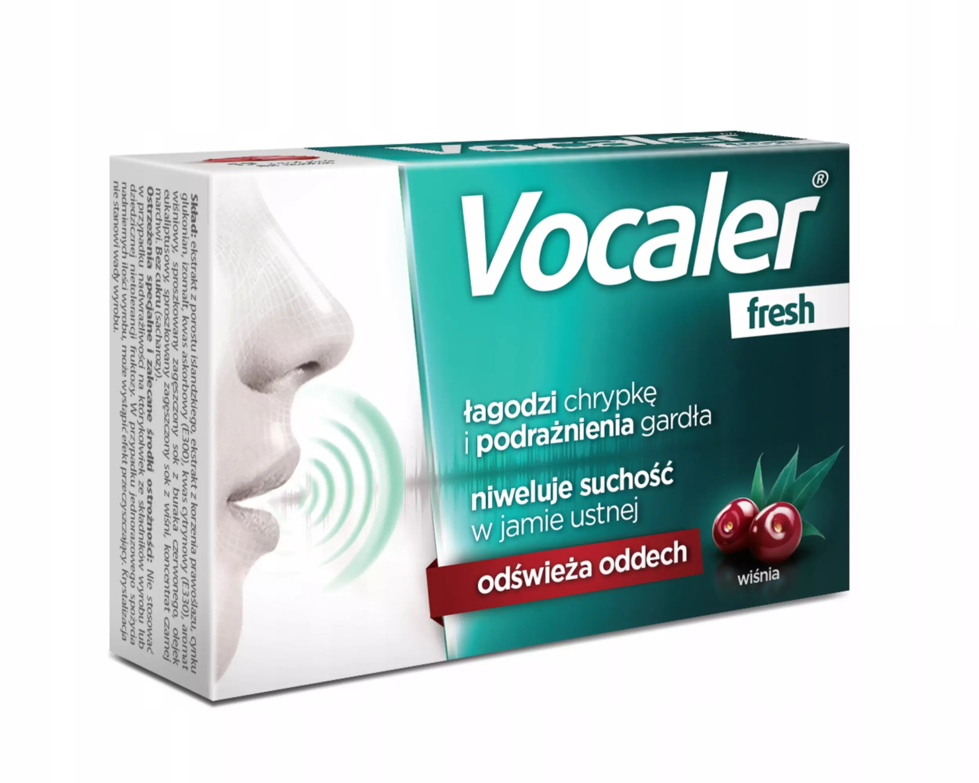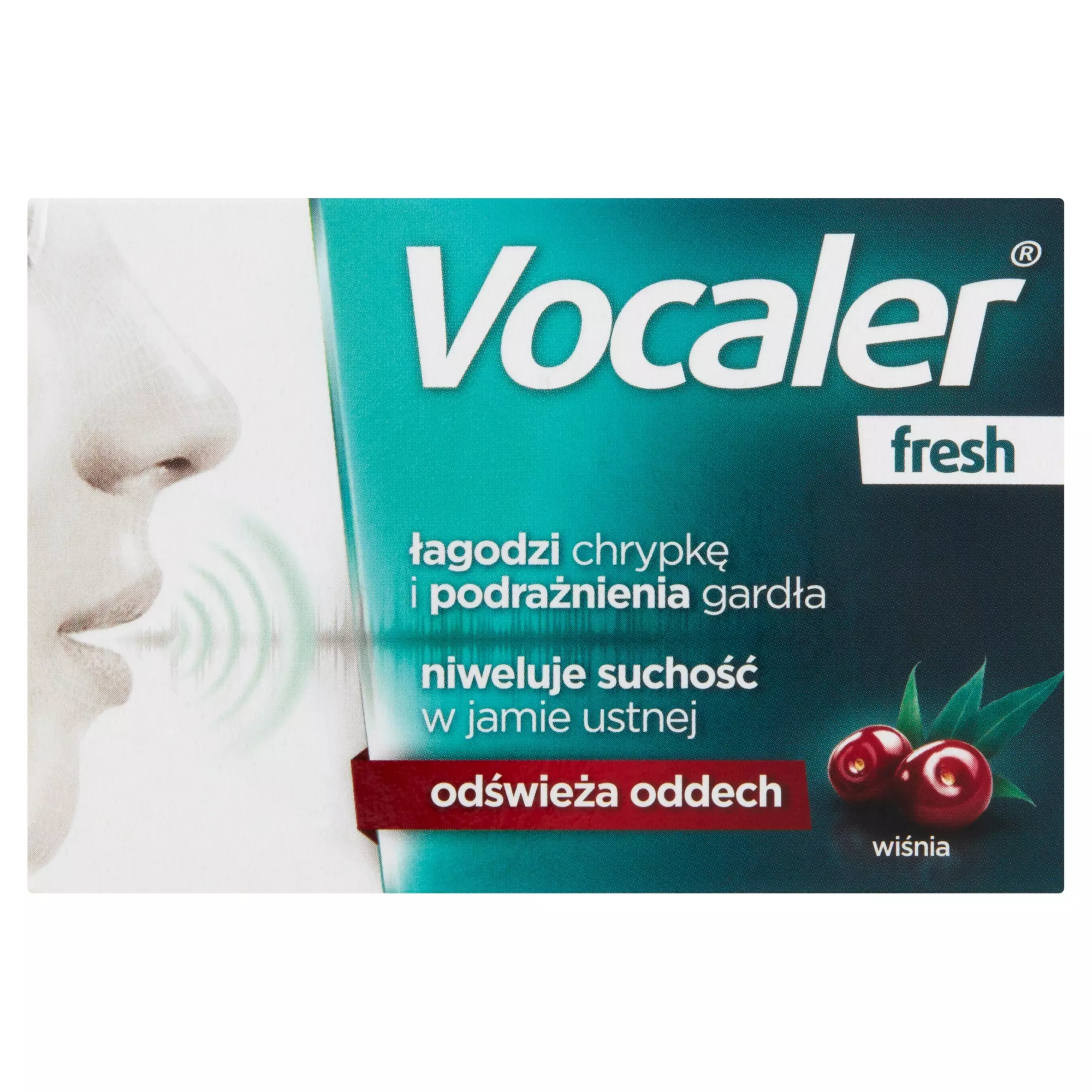 Składniki wyrobu medycznego Vocaler fresh łagodzą chrypkę i podrażnienia gardła, przywracając komfort mówienia. Ziołowe pastylki Vocaler fresh nawilżają błonę śluzową gardła oraz powlekają ją ochronnym filmem, łagodząc dolegliwości związane z przeciążeniem strun głosowych oraz suchością w jamie ustnej spowodowaną m.in. kontaktem z dymem tytoniowym lub przebywaniem w klimatyzowanych pomieszczeniach. Poprzez swoje działanie Vocaler fresh niweluje przejściowe problemy związane z wydobywaniem głosu i przywraca komfort mówienia bez konieczności odchrząkiwania. Dodatkowo zawarty w wyrobie cynk wiąże lotne związki siarki w jamie ustnej, przyczyniając się do utrzymania świeżego oddechu.Vocaler fresh może być stosowany również profilaktycznie, szczególnie u osób narażonych na znaczne obciążenie więzadeł głosowych oraz w trakcie przeziębienia z towarzyszącym bólem gardła.Vocaler fresh o smaku wiśniowym wzbogacony jest o olejek eukaliptusowy.