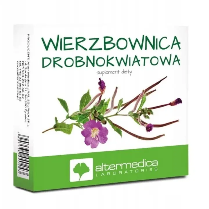Składniki: Sorbitol, ekstrakt z wierzbownicy drobnokwiatowej Epilobium Parviflorum (4:1), substancja przeciwzbrylająca: sole magnezowe kwasów tłuszczowych. 2 tabletki zawierają: ekstrakt z wierzbownicy drobnokwiatowej 350 mg. Masa netto: 60 tabletek. Właściwości: Tabletki zawierające ekstrakt z wierzbownicy drobnokwiatowej, który wspomaga prawidłowe funkcjonowanie prostaty i układu moczowego. Wierzbownica drobnokwiatowa wspiera utrzymanie ruchomości i elastyczności stawów, a także działa przeciwutleniająco i przeciwstarzeniowo. Zwiększa fizjologiczną odporność organizmu w przypadku trudnych warunków atmosferycznych oraz przyczynia się do złagodzenia objawów menopauzy. Zalecane dzienne spożycie: 1 tabletka 2 razy dziennie przed posiłkiem. Przeciwwskazania: Nadwrażliwość na którykolwiek ze składników preparatu. W okresie ciąży i karmienia piersią przed zastosowaniem należy skonsultować się z lekarzem lub farmaceutą. Przechowywanie: Przechowywać szczelnie zamknięte, w temperaturze pokojowej, w suchym miejscu. Przechowywać w sposób niedostępny dla małych dzieci. Producent: Alter Medica J.P.M. Szupina, SP.J.