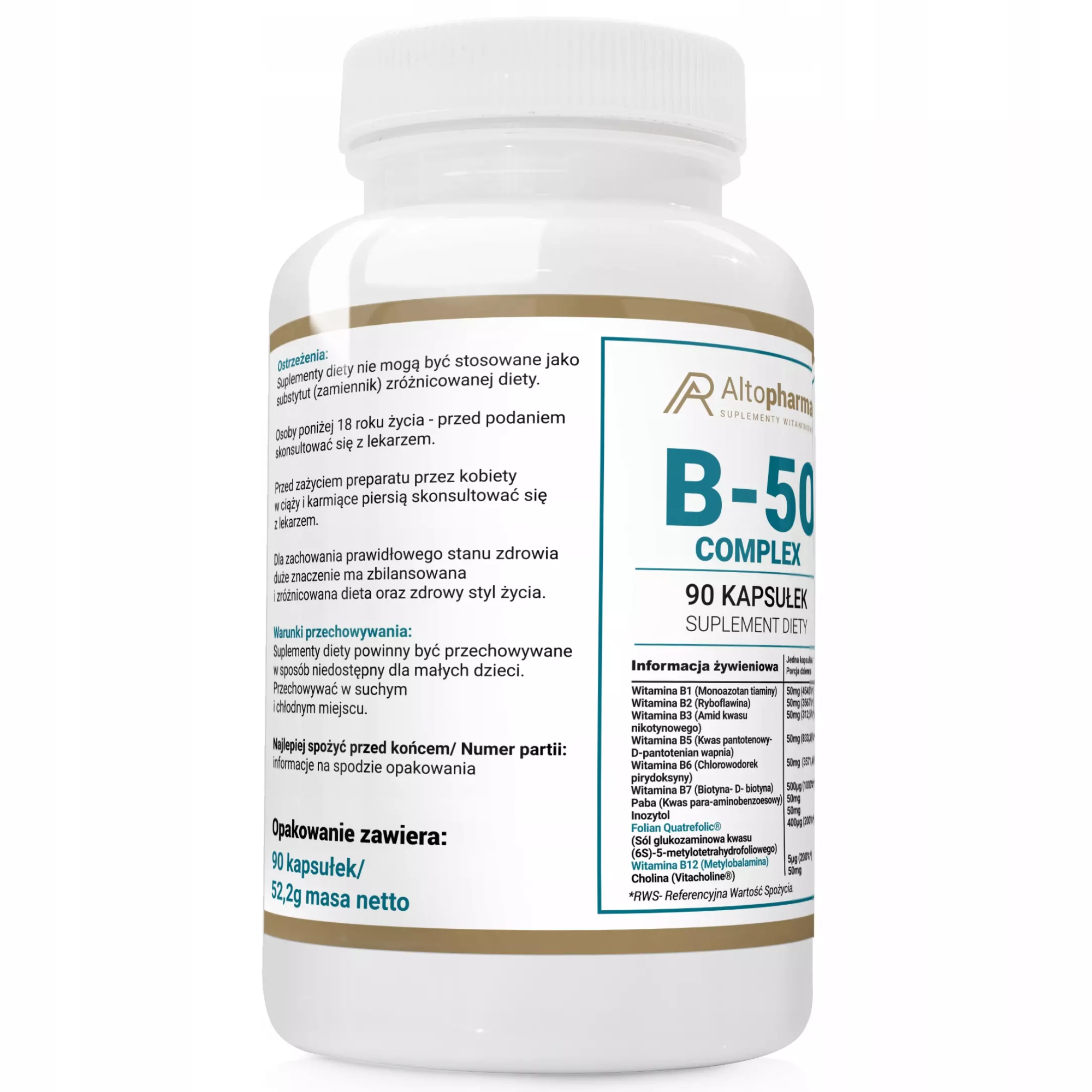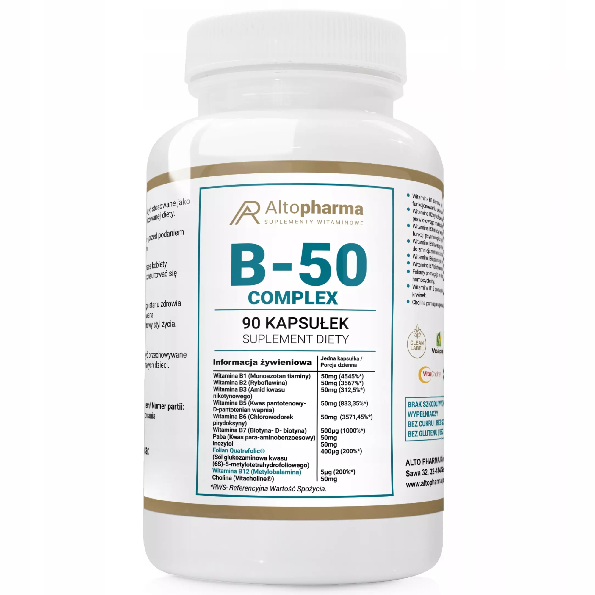 Witamina B-50 METYLOWANA B50 COMPLEX ODPORNOŚĆ PRAWIDŁOWY ROZWÓJ 90 kaps Marka Alto Pharma Witamina B-50 COMPLEX Jedna kapsułka (porcja dzienna): Witamina B1 (Monoazotan tiaminy) - 50mg (4545%*) Witamina B2 (Ryboflawina) - 50mg (3567%*) Witamina B3 (Amid kwasu nikotynowego) - 50mg (312,5%*) Witamina B5 (Kwas pantotenowy - D-pantotenian wapnia) - 50mg (833,35%*) Witamina B6 (Chlorowodorek pirydoksyny) - 50mg (3571,45%*) Witamina B7 (Biotyna - D-biotyna) - 500μg (100%*) Paba (Kwas para-aminobenzoesowy) - 50mg Inozytol - 50mg Folian Quatrefolic®️ (Sól glukozaminowa kwasu (6S)-5-metylotetrahydrofoliowego) - 400μg (200%*) Witamina B12 (Metylobalamina) - 50μg (2000%*) Cholina (Vitacholine®️) - 50mg Witamina B-50 METYLOWANA B50 COMPLEX ODPORNOŚĆ PRAWIDŁOWY ROZWÓJ 90 kaps Podstawowy składnik kompleks witamin z grupy B INFORMACJE: SKŁADNIKI: VitaCholine®️ Cholina (dwuwinian choliny), Kwas pantotenowy (D-pantotenian wapnia), Tiamina (monoazotan tiaminy), Witamina B2 (ryboflawina), WItamina B6 (pirydoksalo-5-fosforan P-5-P), Nicyna (amid kwasu nikotynowego), Folian Quatrefolic®️ (Sól glukozaminowa kwasu (6S)-5-metylotetrahydrofoliowego), Witamina B12 (methylkobalamina), Biotyna (D-biotyna), Paba (kwas para-aminobenzoesowy), Mio-inozytol, kapsułka roślinna Vcaps®️ (hydroksypraopylometylocezula - składnik otoczki)