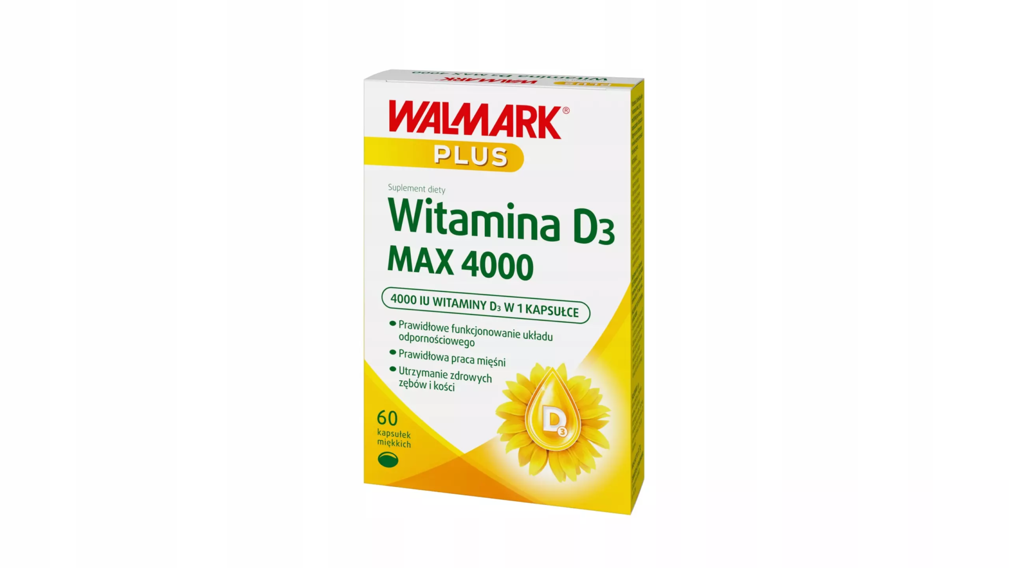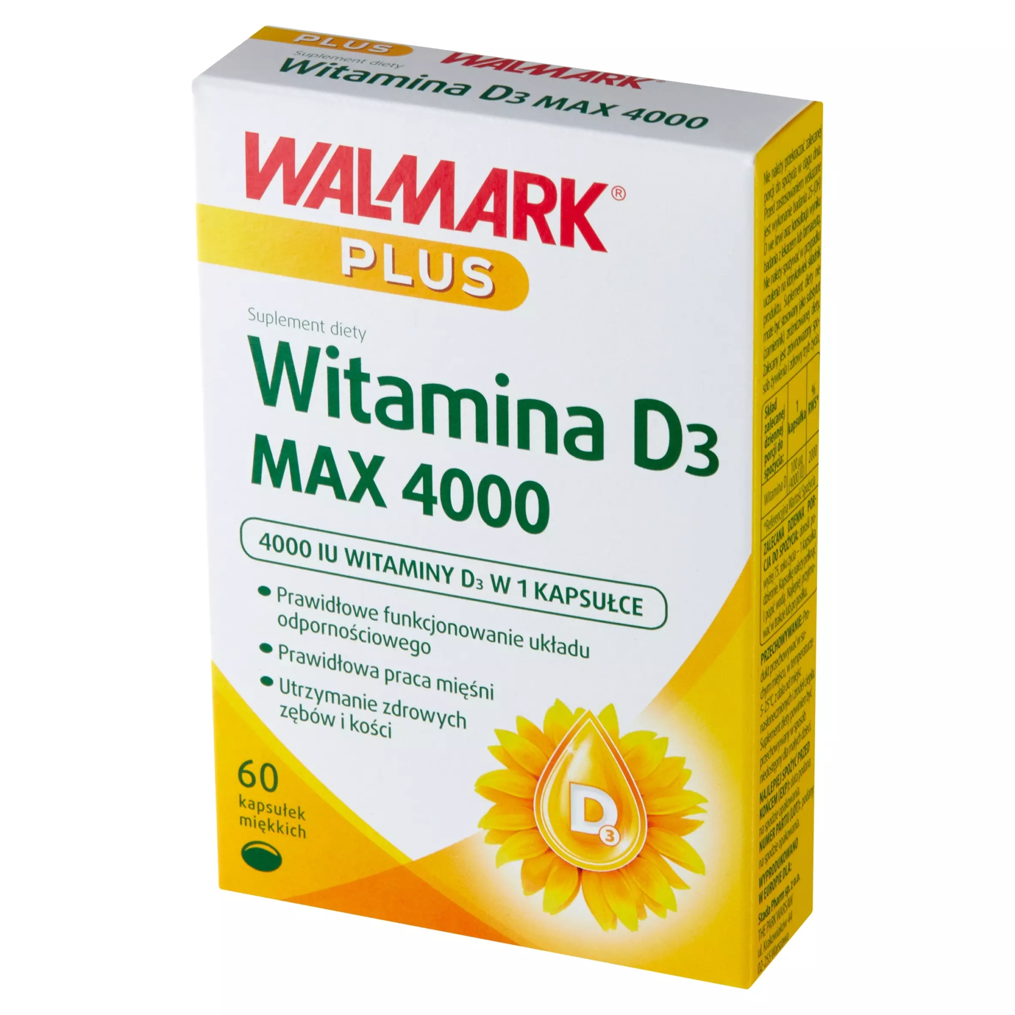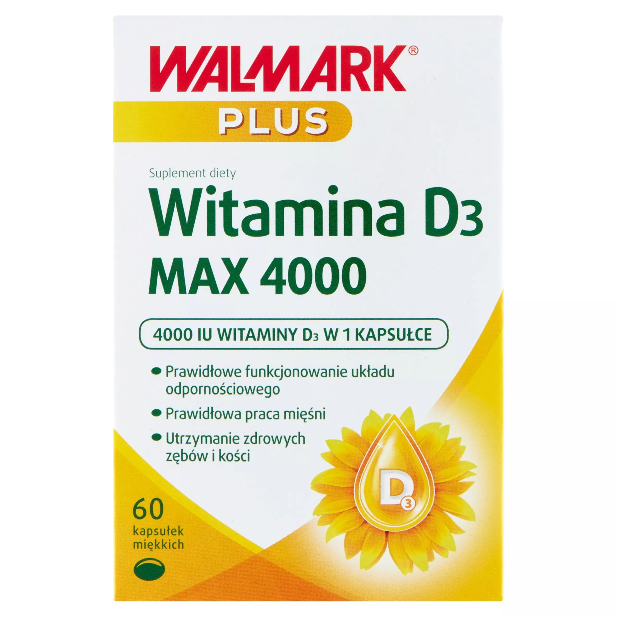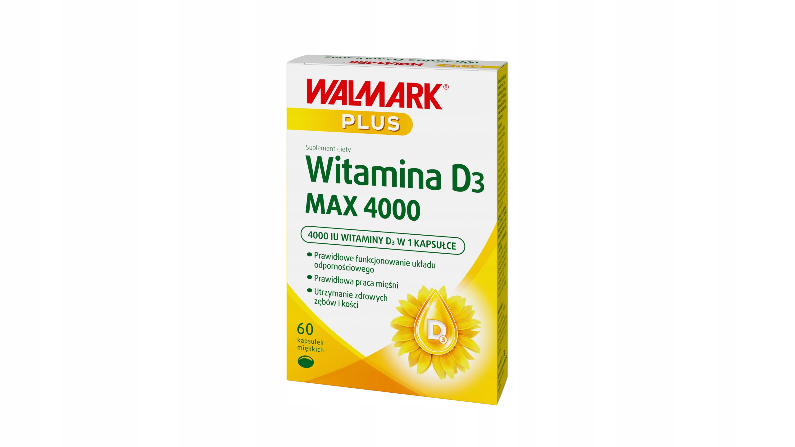 Walmark Plus Witamina D3 Max 4000 to suplement diety w formie żelatynowych kapsułek. Zawiera witaminę D3 (cholekalcyferol), która wspomaga między innymi prawidłową pracę układu odpornościowego, wspiera pracę mięśni oraz przyczynia się do utrzymania zdrowych kości oraz stawów.