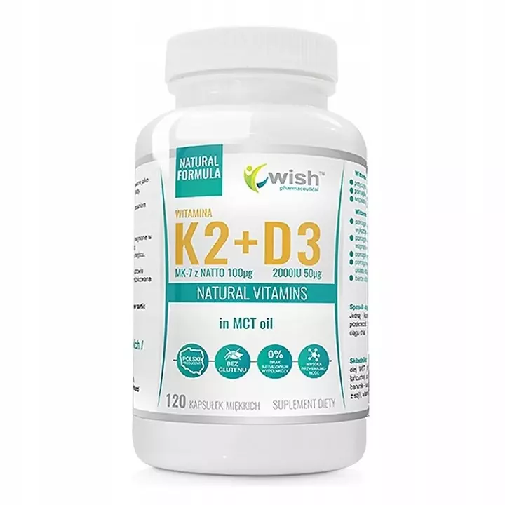 WISH Witamina K2 100mcg+D3 50mcg 100% naturalna witamina D3 i K2 MK-7 to kompozycja witamin pochodząca z naturalnych surowców. Witamina K2 MK-7 jest formą witaminy K2 przyswajalną w najwyższym stopniu przez nasz organizm. Otrzymywana jest z tradycyjnego japońskiego sfermentowanego produktu soi, w wyniku fermentacji bakterii Bacillus subtilis natto , a witamina D3 została otrzymana z lanoliny, składnika wełny owczej, jest to zatem witamina wyprodukowana/wytworzona w taki sam sposób jak podczas ekspozycji ludzkiej skóry na światło słoneczne.