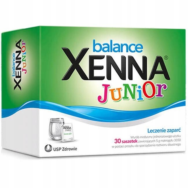 Xenna Balance Junior - leczenie zaparć, saszetki, 30 sztuk Działanie: Wyrób medyczny Xenna Balnce Junior zawiera makrogol 3350, który wiąże wodę w jelitach, przez co stolec jest bardziej miękki i wypróżnienie staje się łatwiejsze. Substancja ta charakteryzuje się wysoką tolerancją i bezpieczeństwem. Nie jest wchłaniana do krwi, nie ulega fermentacji w jelitach i nie podrażnia błony śluzowej przewodu pokarmowego. Wskazania: Leczenie zaparć. Produkt może być stosowany u dzieci od 6. miesiąca życia. Skład: Substancja aktywna: makrogol 3350. Substancje pomocnicze: dwutlenek krzemu, aromat, sacharynian sodu. Sposób użycia: