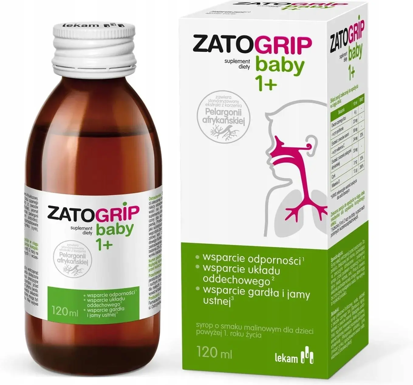 Zatogrip baby 1+ - to suplement diety w postaci płynu, który zawiera w składzie ekstrakty z owoców czarnego bzu, owoców aceroli, korzenia pelargonii afrykańskiej oraz cynk i witaminę D. Produkt przeznaczony dla dzieci powyżej 1. roku życia.