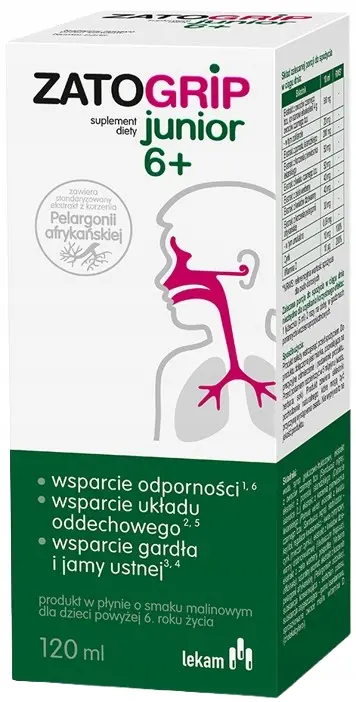 ZATOGRIP JUNIOR to podwójna siła dzięki połączeniu standaryzowanych ekstraktów roślinnych z korzenia pelargonii afrykańskiej oraz owoców czarnego bzu.