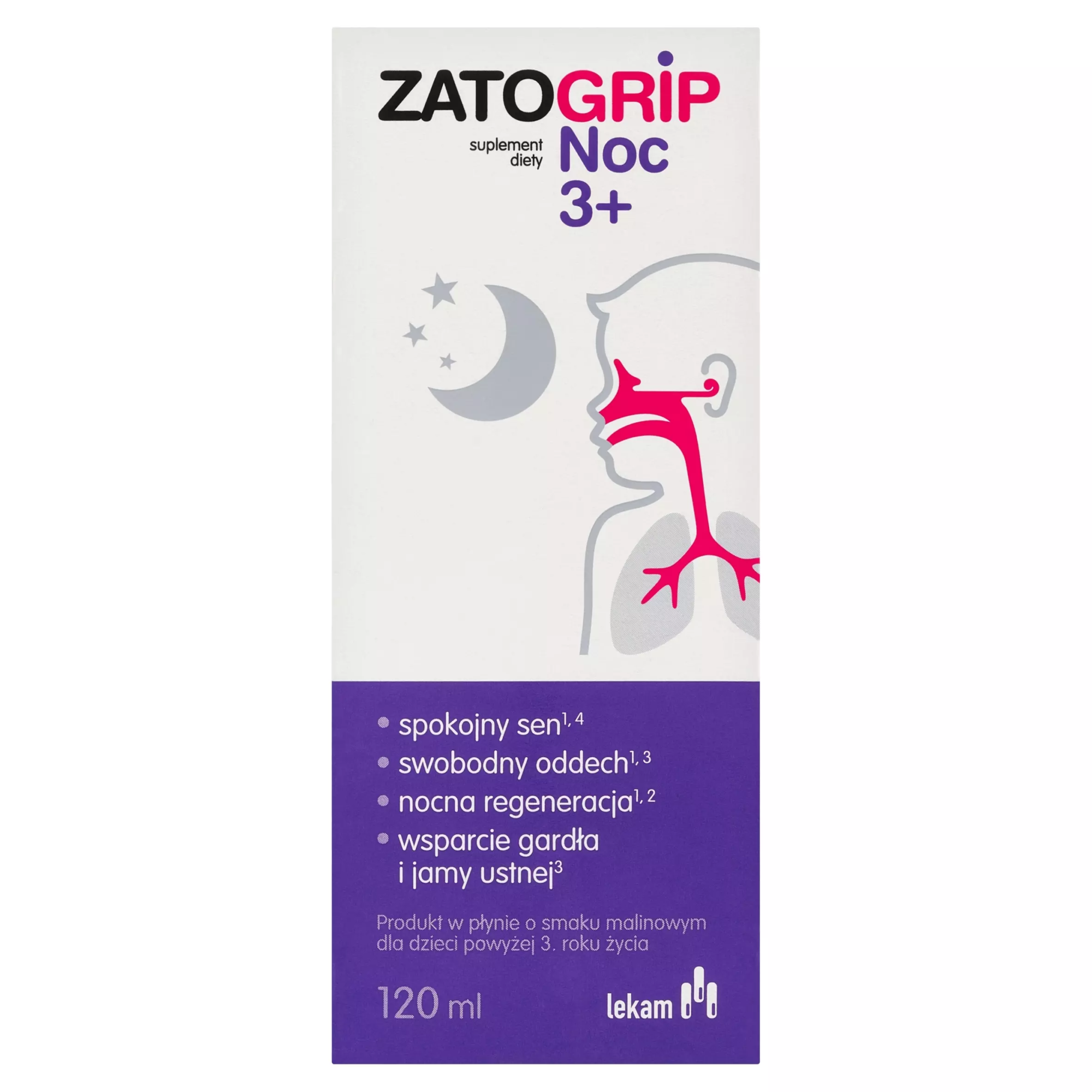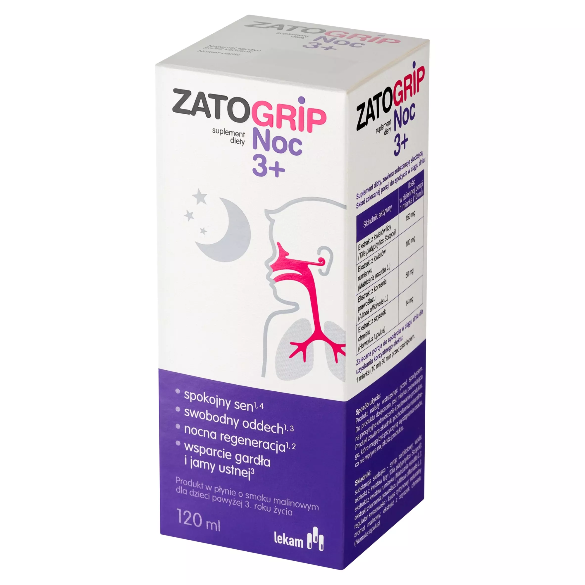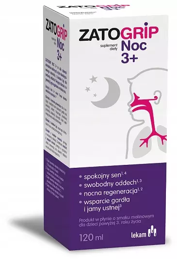 ZATOGRIP Noc 3+ produkt w płynie o smaku malinowym dedykowany jest dla dzieci powyżej 3 roku życia, w celu uzupełnienia codziennej diety w składniki wspomagające swobodny oddech i nocną regenerację dziecka w trakcie snu.