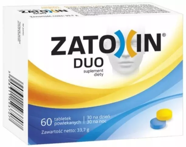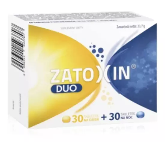 Zatoxin Duo, suplement diety w postaci tabletek powlekanych. Tabletka na dzień zawiera witaminę B2 (ryboflawina) oraz niacynę, które pomagają w utrzymaniu prawidłowego stanu błon śluzowych oraz przyczyniają się do zmniejszenia uczucia zmęczenia i znużenia. Cynk oraz selen zawarte w tabletce na noc pomagają w prawidłowym funkcjonowaniu układu odpornościowego oraz w ochronie komórek przed stresem oksydacyjnym. Melatonina spożywana w tabletce na noc pomaga w skróceniu czasu potrzebnego na zaśnięcia.