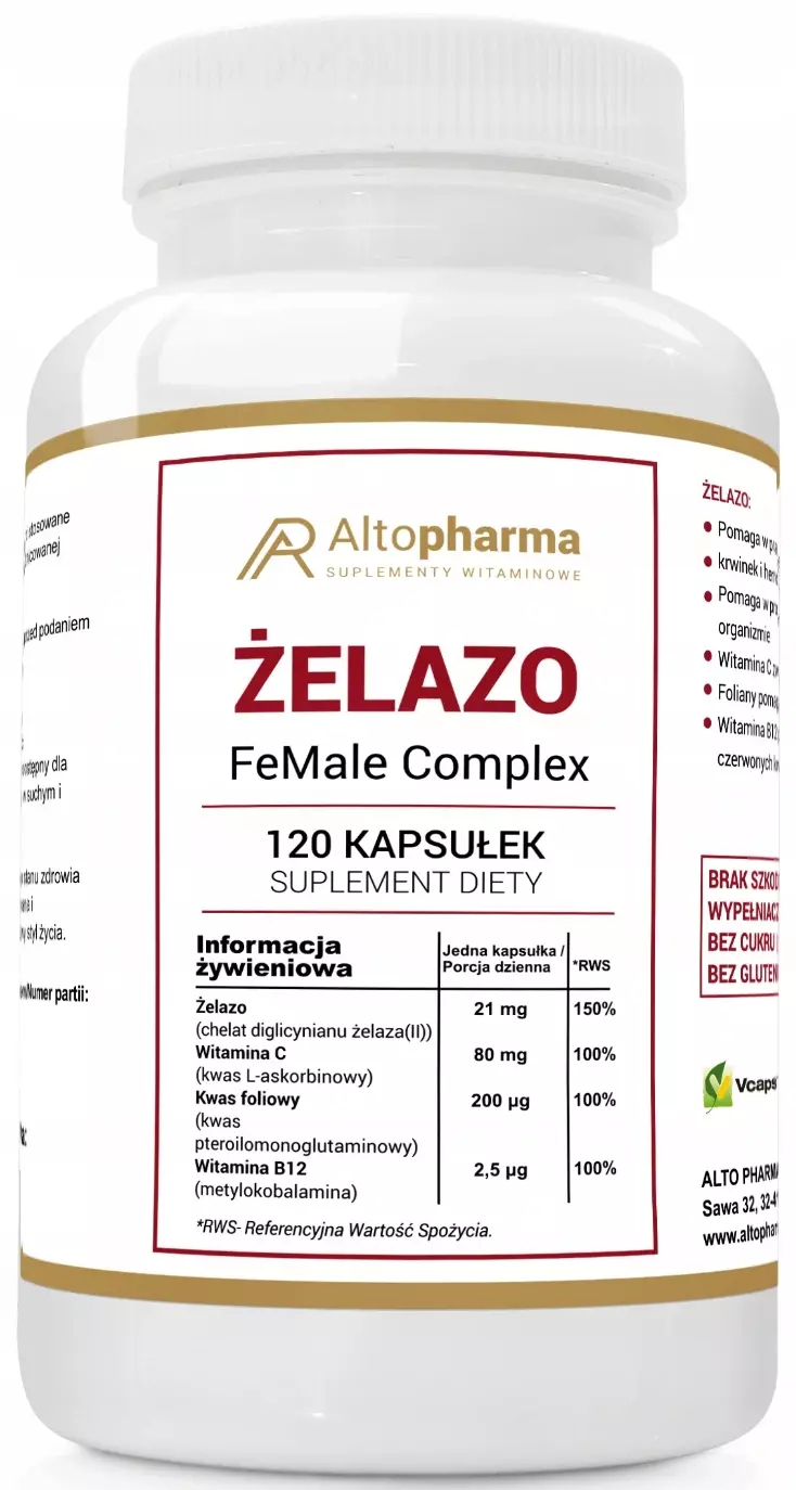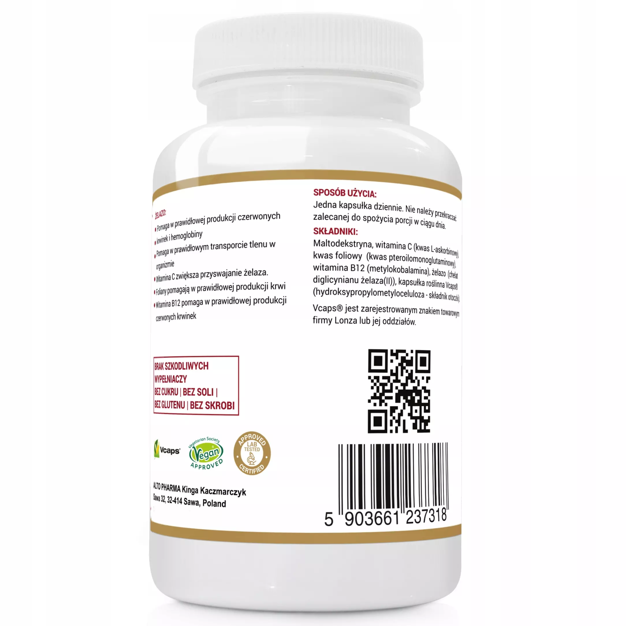 Vcaps® - kapsułki wykonane z hydroksypropylometylocelulozy, pozwalają na kontrolowanym uwalnianiu się substancji aktywnych przez co nie podrażniają żołądka. BRAK SZTUCZNYCH WYPEŁNIACZY - w składzie kapsułki nie występują substancje takie jak: sole magnezowe kwasów tłuszczowych (stearynian magnezu), wodorofosforan wapnia, ditlenek krzemu, celuloza mikrokrystaliczna DLA OSÓB: intensywnie trenujących sport, pracujących fizycznie, żyjących w zanieczyszczonym środowisku. ODPOWIEDNI PRODUKT: dla wegan i wegetarian ZERO GMO -produkt wolny od GMO ZERO CUKRU, ZERO SOLI, ZERO SKROBI, ŻELAZO CHELAT WITAMINA B9 B12 C DLA KOBIET WEGAN ŻELAZO CHELAT WITAMINA B9 B12 C DLA KOBIET WEGAN Data ważności brak informacji Chelat Żelaza Complex: