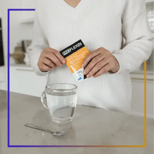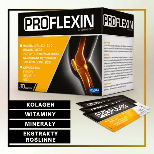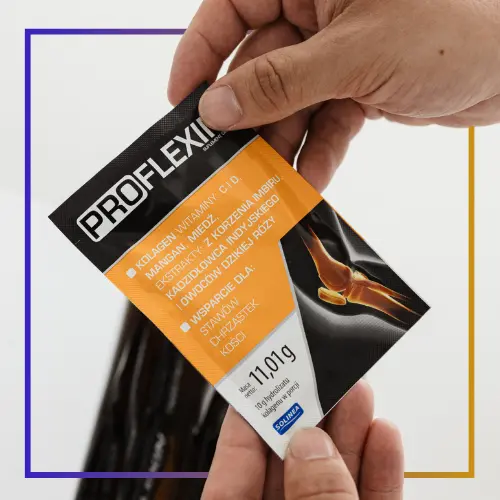 Proflexin zawiera kolagen, witaminy, minerały i ekstrakty roślinne wspierające stawy i cały układ ruchu. To aż 8 składników aktywnych w saszetce.