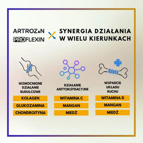 Połączenie suplementacji Artrozinu i Proflexinu to synergia działania składników aktywnych i wielokierunkowy wpływ na stawy i cały układ ruchu!