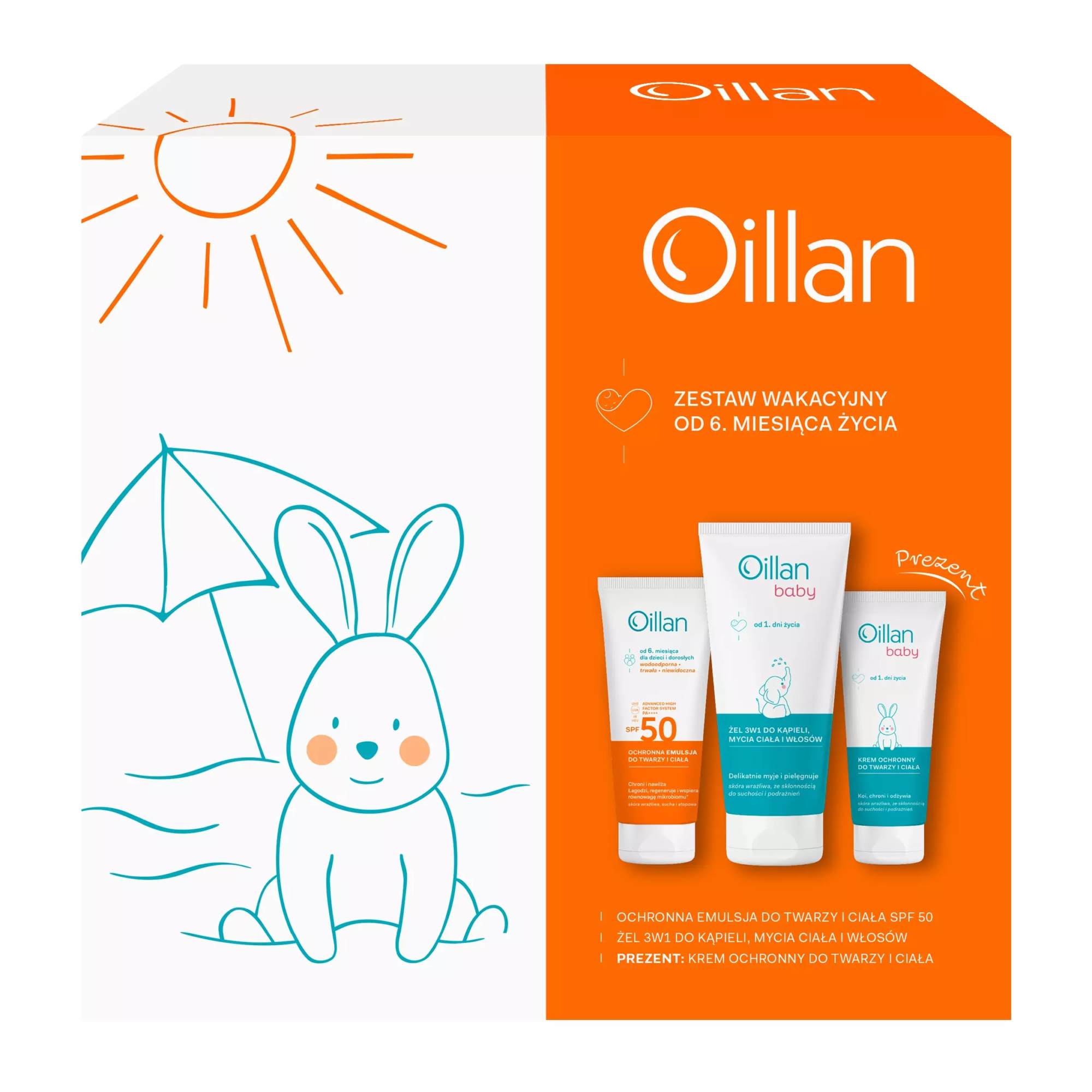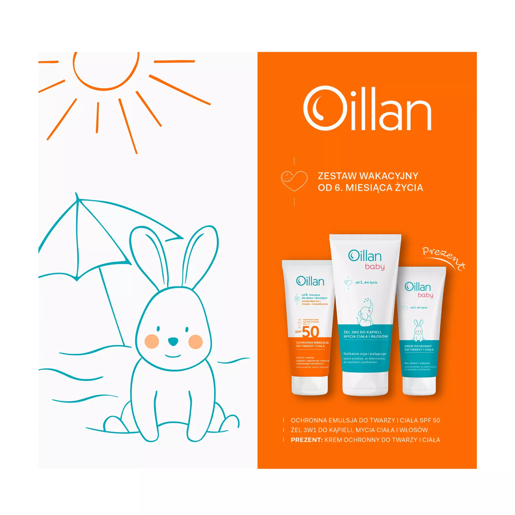 Zestaw wakacyjny Oillan Ochronna emulsja z filtrem SPF50 100ml + Żel 3w1 do mycia 200ml + Krem 75ml