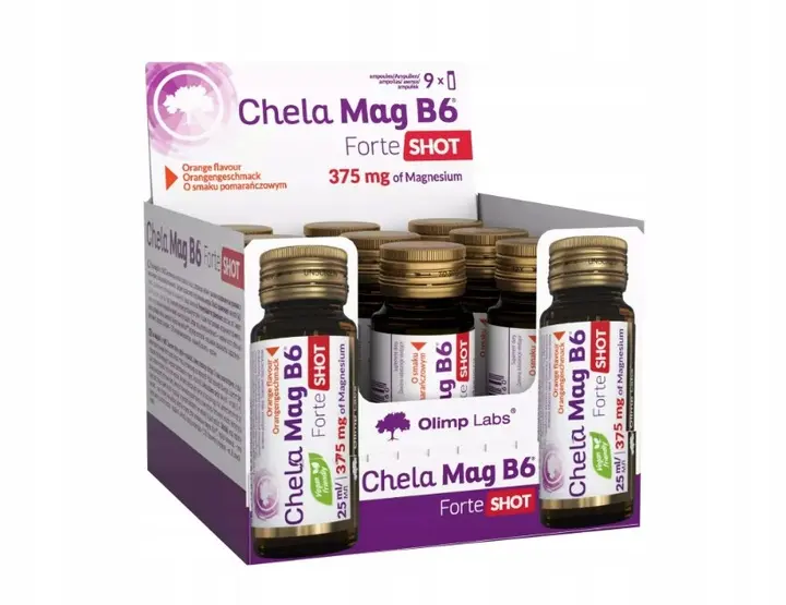 Olimp Chela-Mag B6® Forte Shot - suplement diety w płynie w ampułce. Zawiera substancje słodzące. Produkt zawiera wysoko przyswajalną formę magnezu w postaci chelatu aminokwasowego oraz witaminę B6.