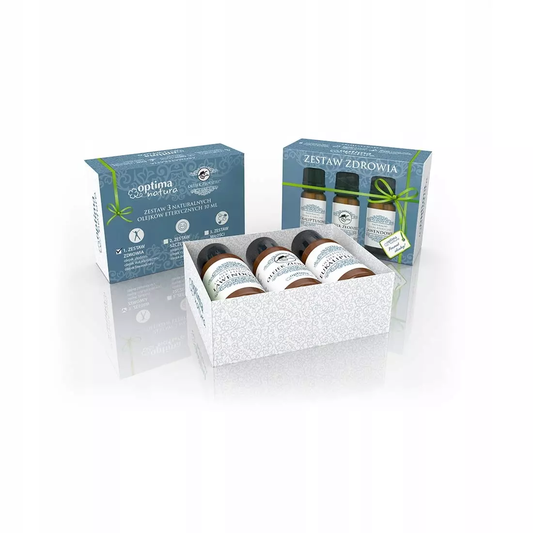 Zestaw zdrowia do aromaterapii to trzy bardzo popularne, 100% naturalne olejki eteryczne Optima Natura ( Naturalny Olejek Złodziei, Naturalny Olejek Lawendowy, Naturalny Olejek Eukaliptusowy) o pojemnościach 10ml w ładnym i praktycznym pudełeczku.